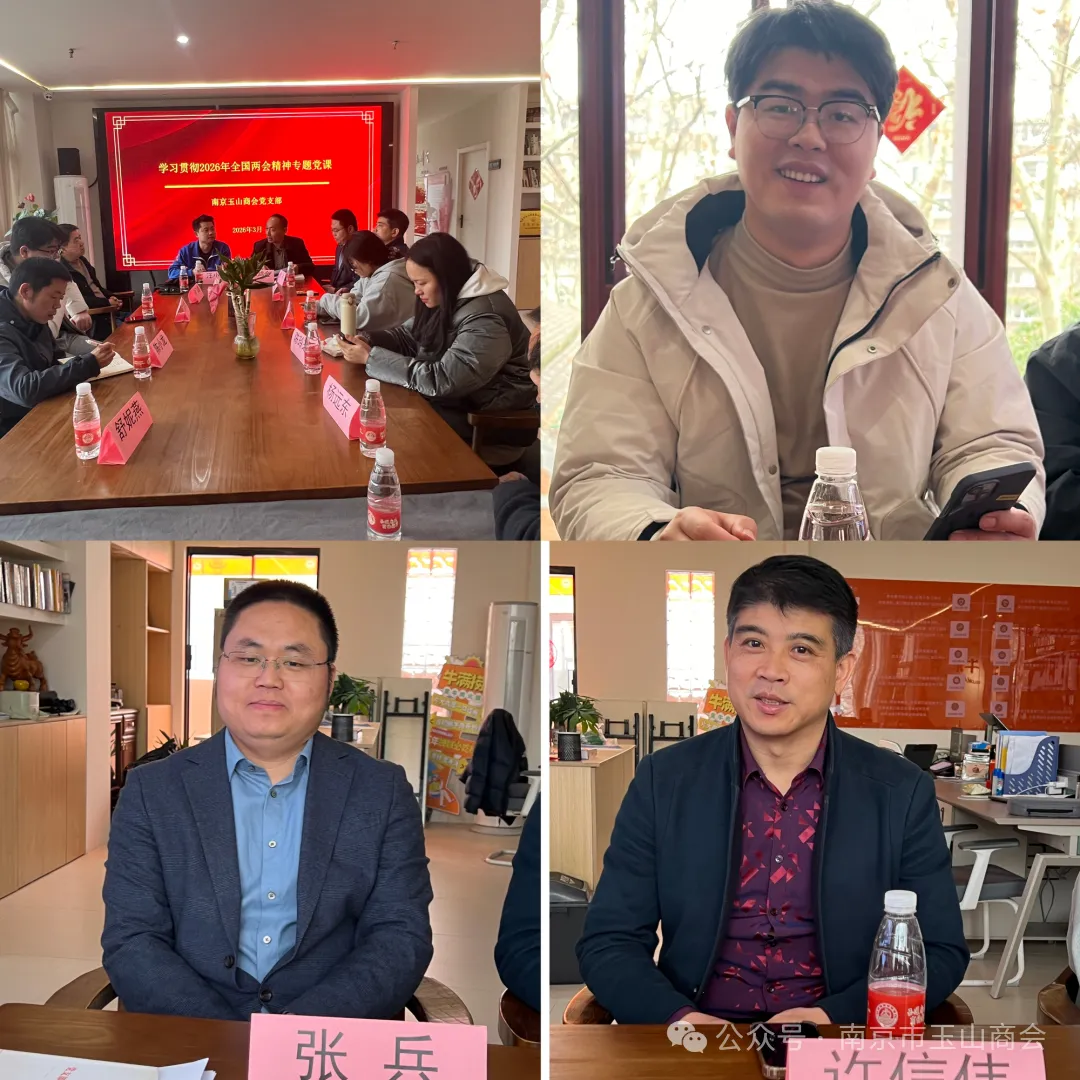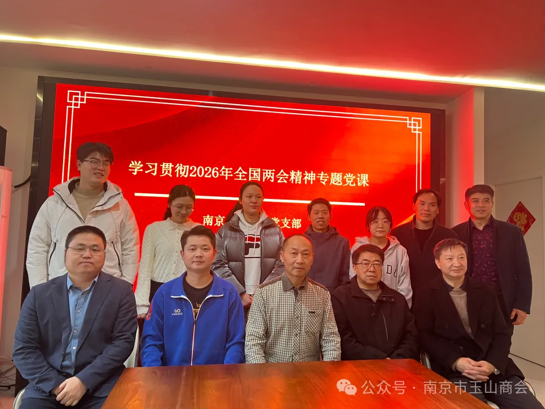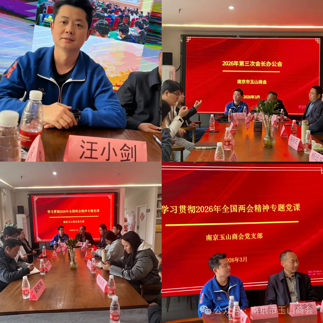 春潮涌动,万象更新。为紧跟国家发展步伐,准确把握时代脉搏,2026年3月15日下午,南京市玉山商会在商会轮值会长汪小剑、常务副会长张兵、常务副会长兼监事长陈忠、商会关工委副主任叶飞雄等商会领导组织下在商会会议室召开全国两会精神专题学习会。会议严格按照上级组织部署要求,通过集中观看视频、书记讲党课、交流研讨等形式,深入学习领会两会精神实质与核心要义,为商会及会员企业的高质量发展注入强大的思想动力。