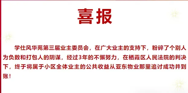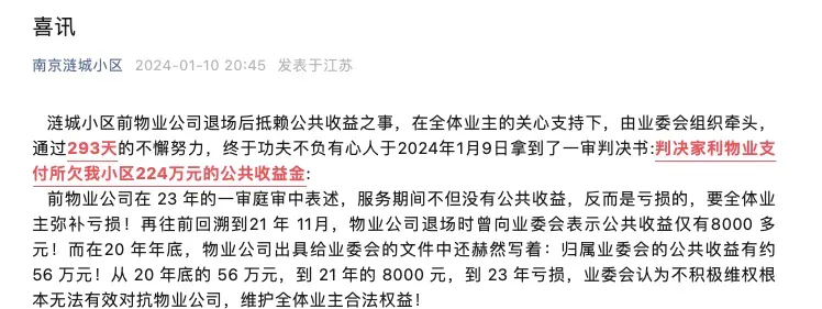 江宁天泽苑小区业委会此前状告前物业,要求其返还2021年度及2022年度的公共收益,大约56万元,最终再次胜诉,业主激动发文!