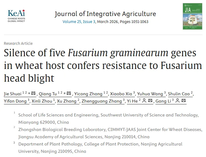 Jie Shuai, Qiang Tu, Yicong Zhang, Xiaobo Xia, Yuhua Wang, Shulin Cao, Yifan Dong, Xinli Zhou, Xu Zhang, Zhengguang Zhang, Yi He, Gang Li. 2026. Silence of five Fusarium graminearum genes in wheat host confers resistance to Fusarium head blight. Journal of Integrative Agriculture, 25(3): 1051-1063.