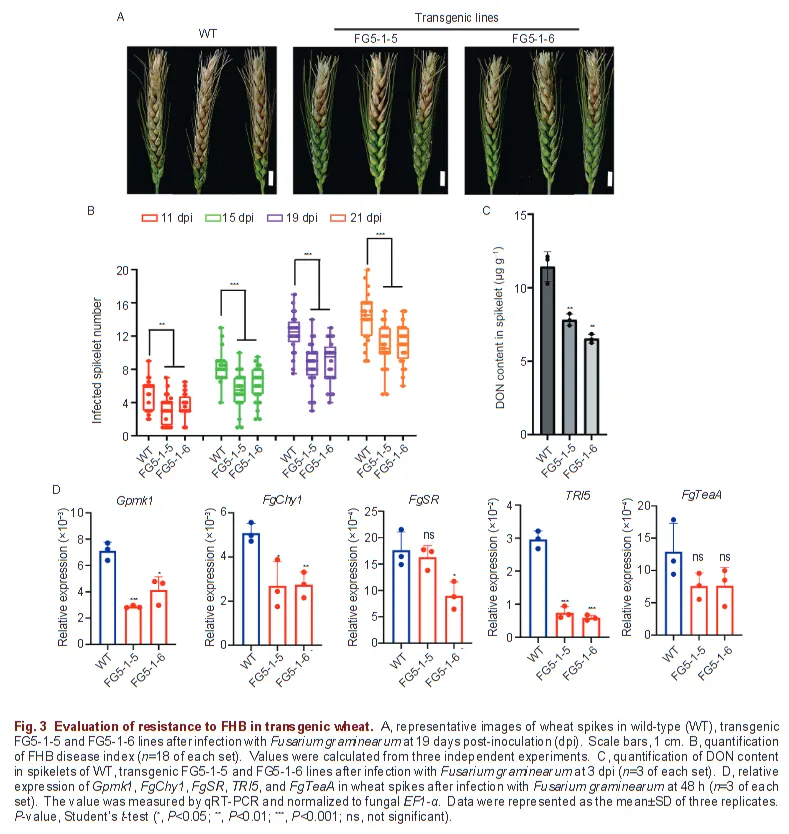 该研究针对禾谷镰刀菌中的五个致病关键基因蛋白激酶基因Gpmk1、锌指蛋白基因FgChy1、转录因子FgSR、DON合成基因TRI5和细胞末端标记蛋白基因FgTeaA,采用喷雾诱导基因沉默(SIGS)和宿主诱导基因沉默(HIGS)两种方法,验证了通过RNA干扰沉默这些基因以实现防控小麦赤霉病的可行性。研究结果表明,SIGS可以显著降低靶标基因的表达,并抑制禾谷镰刀菌在小麦叶片中的扩展。其中,喷施五种siRNA的组合表现出最强的抗性。此外,构建了同时干扰沉默这五个靶基因的RNAi植物表达载体,并获得了稳定表达的RNAi转基因小麦植株。进一步对转基因小麦进行分析表明,它们对赤霉病和茎基腐病都表现出较强的抗性,并降低了小麦中DON的积累,而且没有对小麦的生长和产量性状产生不利影响。