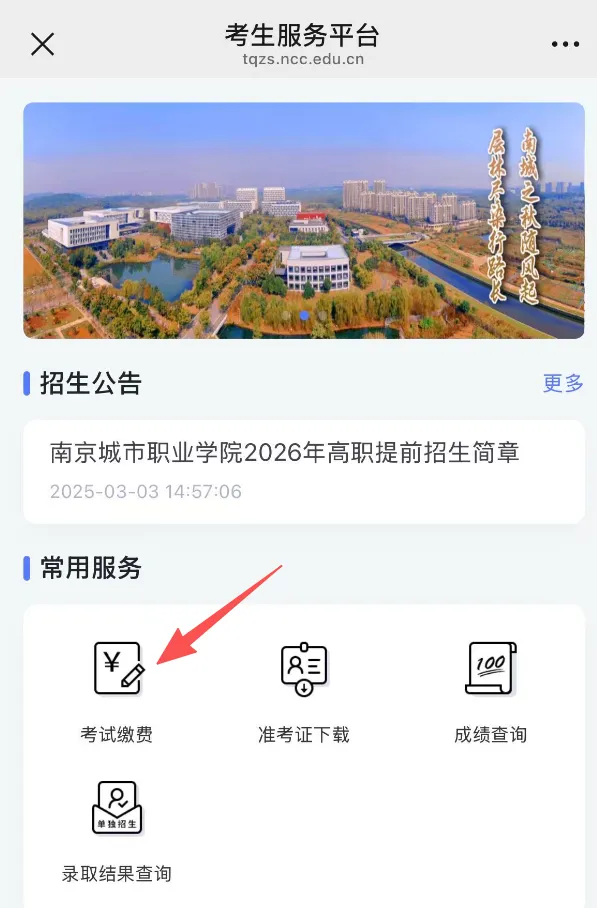 我校2026年提前招生开通考生服务平台,为大家提供缴费、准考证打印以及后期的成绩查询、录取查询等服务。