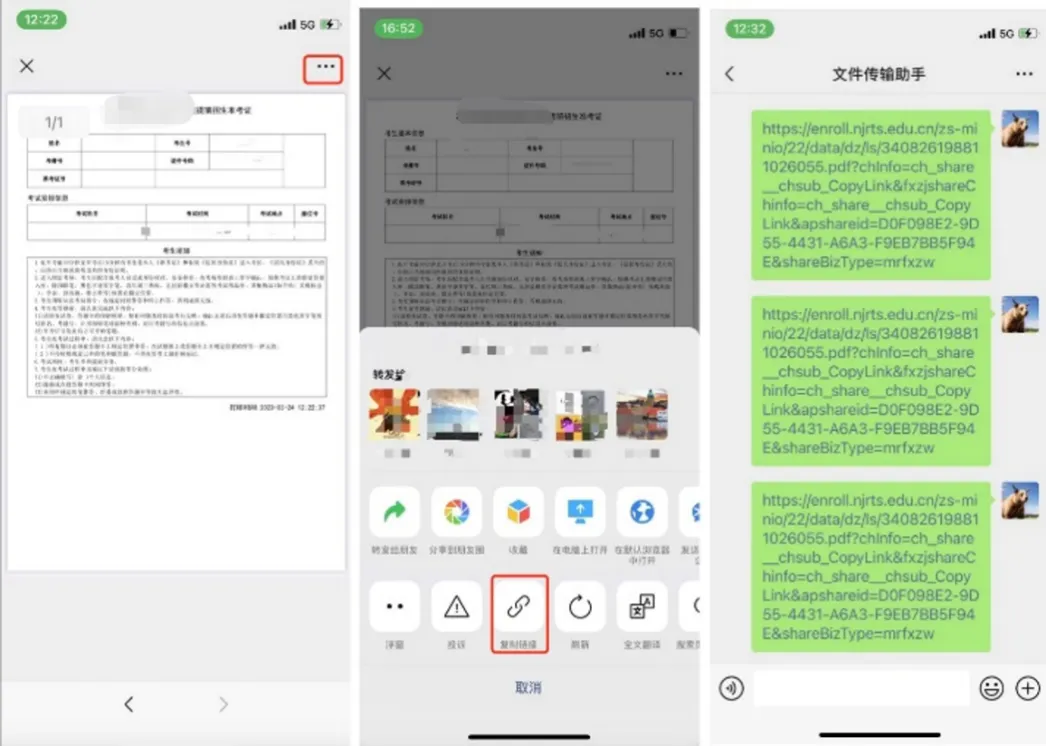 点击右上角的"..."按钮后,在浮窗内点击"复制链接",在微信内粘贴链接。点击访问该链接后,随时可以查看自己的准考证信息,打开链接进行打印。