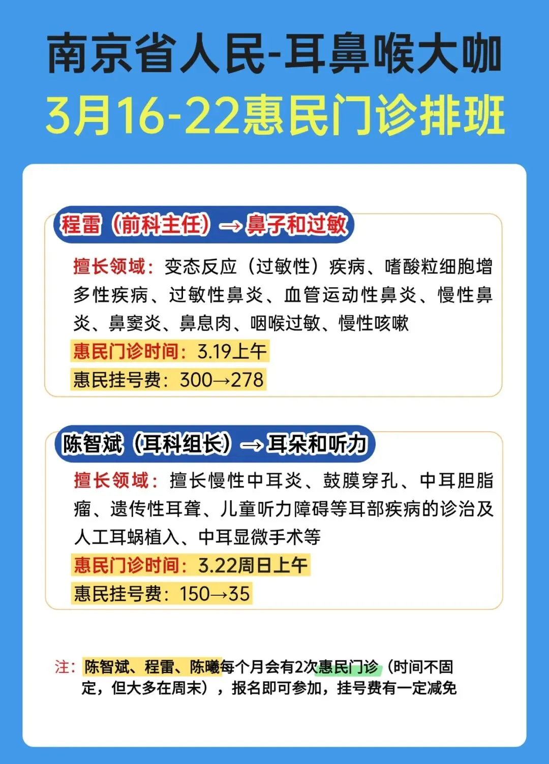 注:陈智斌、程雷、陈曦每个月会有2次惠民门诊(时间不固定,但大多在周末),报名即可参加,挂号费有一定减免