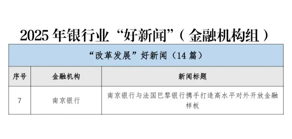 3月17日,中国银行业协会发布“2025年银行业好新闻”评选结果,南京银行报送的新闻《南京银行与法国巴黎银行携手打造高水平对外开放金融样板》获评2025年银行业“改革发展”好新闻奖,这也是南京银行连续六年荣获该奖项。