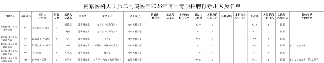 附件:南京医科大学第二附属医院2026年博士专项招聘拟聘用人员名单