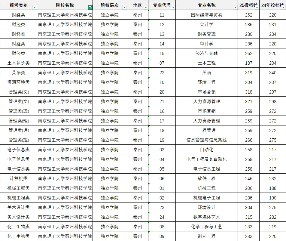 财经类是南京理工大学泰州科技学院的热门大类,南京理工大学泰州科技学院专转本专业分数线涨幅显著。会计学、审计学 25 年投档线均为 286 分,财务管理 280 分,较 24 年均有大幅提升,依托学校经管类教学资源,这类专业在财会、金融领域就业认可度高,是文科考生的优质选择。