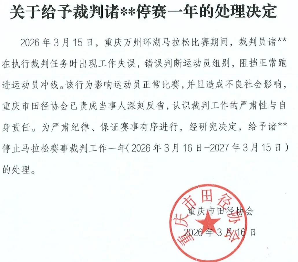 另一份是重庆万州环湖马拉松冠军终点被拦事件的处罚,处罚对象是裁判员