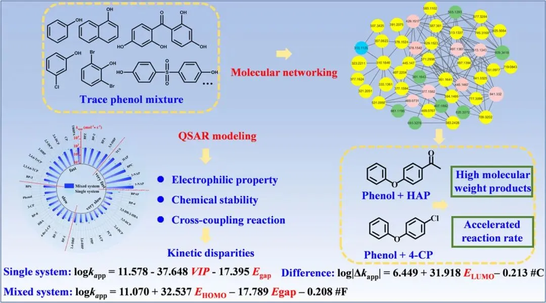 该项研究创新点在于通过QSAR模型耦合分子网络技术,解析混合酚类降解的“协同加速”机制。亮点包括构建35种酚类动力学数据库、揭示交叉聚合主导路径、开发预测性构效关系模型。
