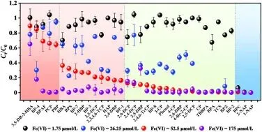 图1:Fe(VI)投加量(1.75-175μmol/L)对混合溶液中35种痕量酚类去除率的影响。