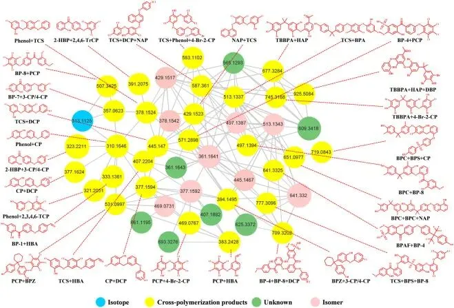 图3:混合体系中Fe(VI)氧化酚类生成聚合产物的分子网络图。