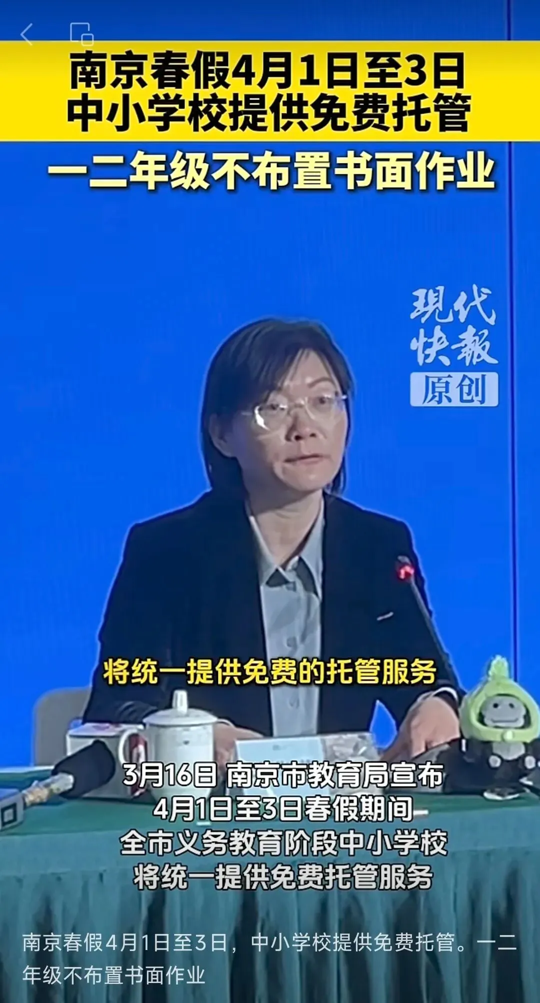4月1日至3日春假期间,考虑到部分家庭存在“看护难”的实际情况,全市义务教育阶段中小学校将统一提供免费托管服务。