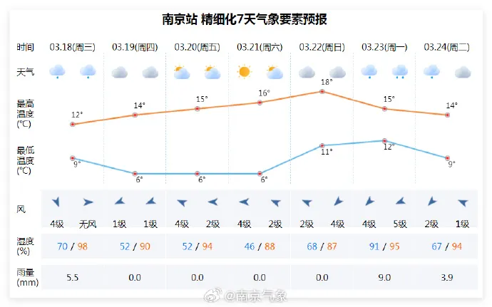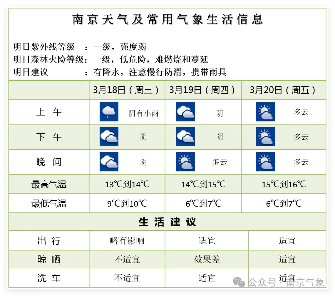 明天夜里雨止转阴天偏北风4到5级阵风6级明晨最低气温: 8℃到9℃明天最高气温: 12℃到13℃3月19日全市阴转多云偏东风3到4级3月19日最低气温: 6℃到7℃3月19日最高气温: 14℃到15℃3月20日全市多云到晴偏东风3到4级3月20日最低气温: 6℃到7℃3月20日最高气温: 14℃到15℃