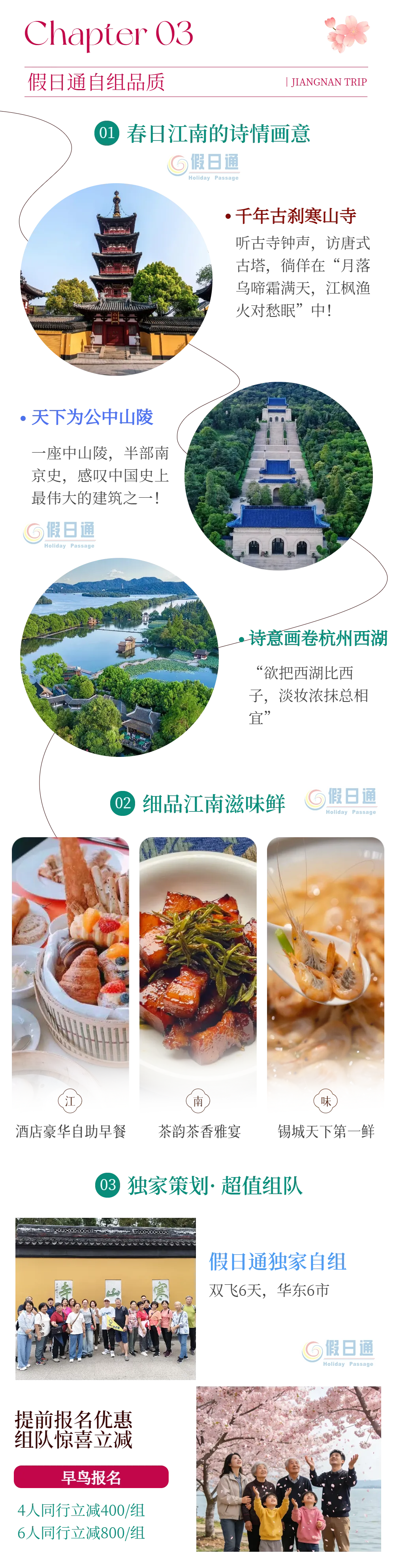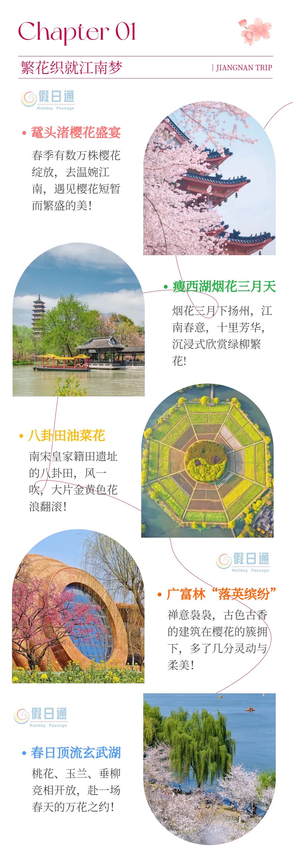 西湖苏堤春晓+八卦田油菜花+古风春韵广富林+玄武湖春日盛宴+千年古刹寒山寺+中山陵