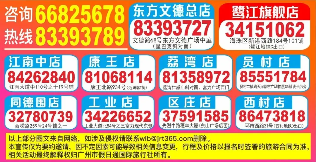 更多线路优惠咨询详情可致电以下门店或登录官网www.jrt365.com