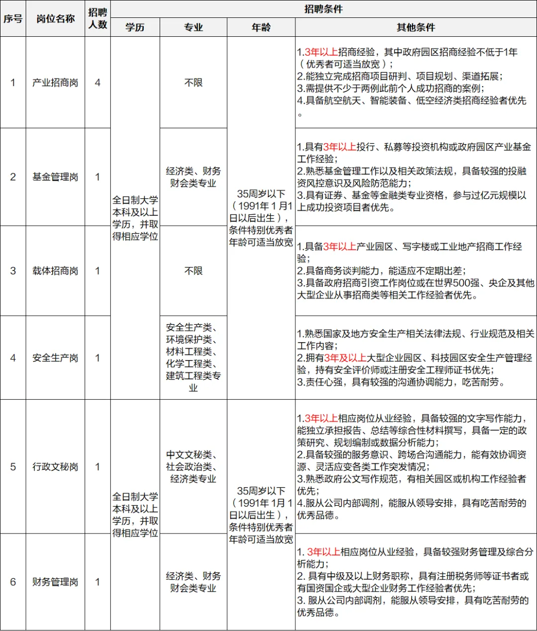 产业招商岗4名,基金管理岗1名,载体招商岗1名,安全生产岗1名,行政文秘岗1名,财务管理岗1名,共计9名。