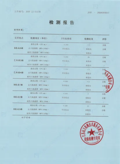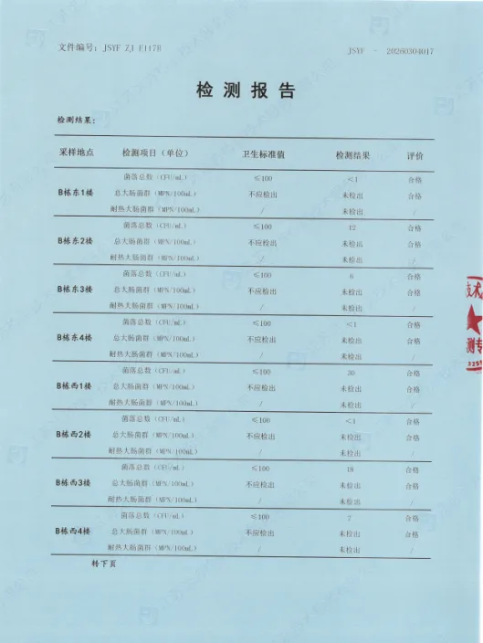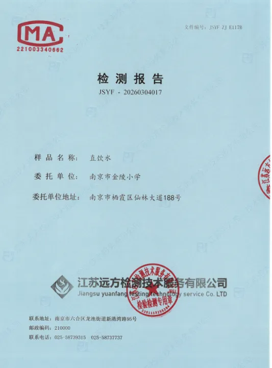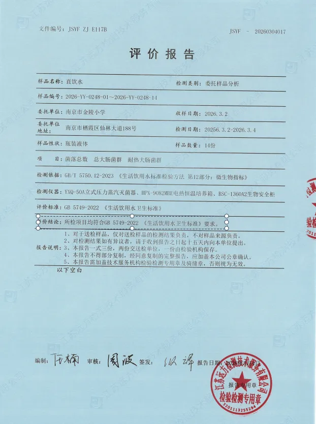 本次直饮水检测工作委托江苏远方检测技术服务有限公司完成,检测范围覆盖我校一至六年级各教学楼区域的共14台直饮水设备。检测人员严格遵循规范流程进行水样采集、实验室分析,最终出具的《直饮水检测报告》(报告编号:[JSYF -20260304017])显示,检测依据:GB/T 5750.12-2023《生活饮用水标准检验方法第12部分:微生物指标》,评价标准:GB 5749-2022《生活饮用水卫生标准》,检测结果:所检项目均符合GB 5749-2022《生活饮用水卫生标准》要求,学生可放心饮用。