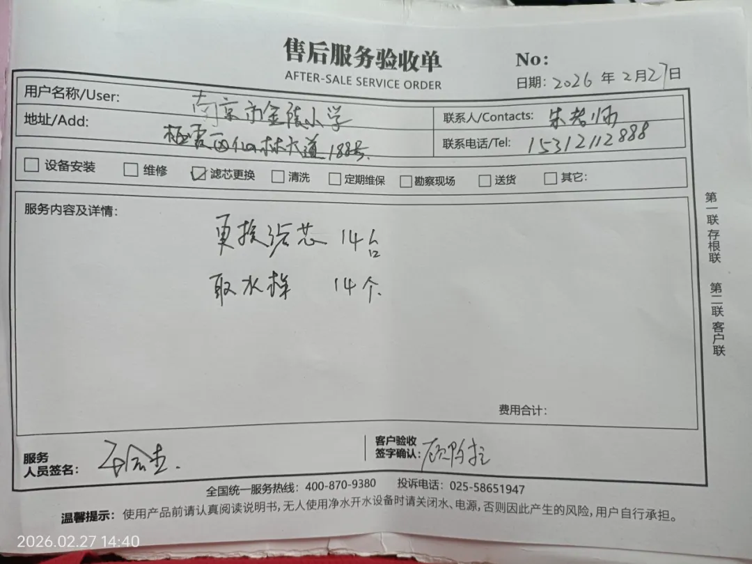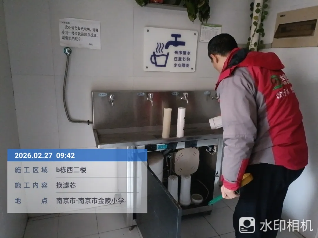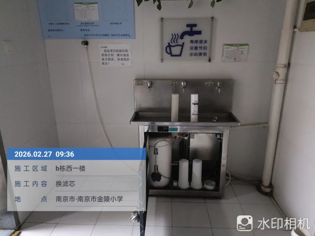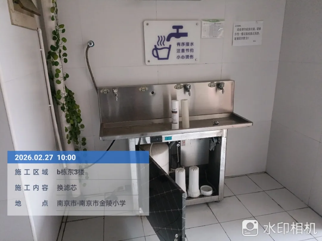 在日常维保方面,我校已与专业维保公司建立长期合作机制,近期维保记录显示,维保人员于2026年2月27日完成了全校直饮水设备的滤芯更换工作,共更换各级滤芯14套,开展了设备运行参数调试与漏水检测,确保每一台设备都处于最佳运行状态。所有维保操作均有详细记录,包括维保人员签字、操作时间、使用耗材型号等信息,可随时供家长查阅。