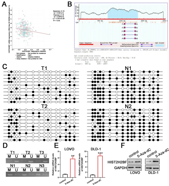 图1:DNA低甲基化可导致HIST2H2BF在结直肠癌中表达上调
