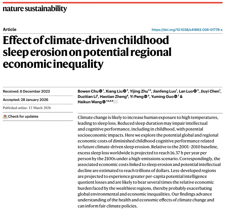 气候变化很可能会增加人类暴露于高温环境的程度,从而导致睡眠减少。睡眠时间的缩短可能会损害智力和认知表现,包括在儿童时期,进而产生潜在的社会经济影响。本文探讨了未来由气候变化驱动的睡眠减少对儿童认知表现下降所带来的全球及区域经济成本。相较于2001—2010年的基准期,在高排放情景下,到21世纪末,全球范围内每人每年预计将额外损失16.37小时的睡眠时间。相应地,与睡眠减少及潜在智力下降相关的经济成本预计将达到数万亿美元。欠发达地区预计将经历更大的人均潜在智商损失,并可能承担数倍于最富裕地区的相对经济负担,从而很可能加剧全球环境和经济不平等。我们的研究结果深化了对气候变化在健康和经济层面影响的理解,并可为制定更加公平的气候政策提供参考。