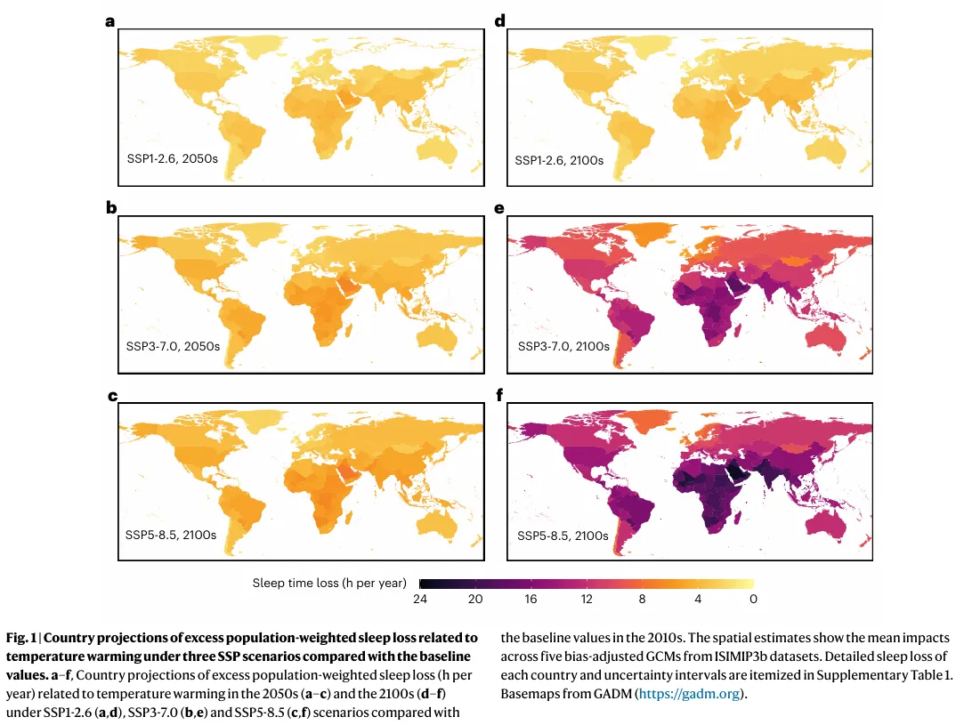 全球变暖正以前所未有的速度发生¹²,其中包括极端热浪发生频率和持续时间的增加³,并同时对公共健康和社会经济发展造成严重影响⁴。暴露于高温环境与超额死亡率、住院率增加、不良妊娠结局、劳动生产率下降以及心理健康问题相关,从而带来经济成本⁵⁻¹⁰。此外,环境温度还可能对人类睡眠状况产生影响¹¹。从生理角度来看,夜间核心体温的下降与入睡过程密切相关¹²。在高环境温度下,人体与周围环境之间的热梯度减小,散热效率低于产热,导致体内热量积累,使核心体温升高并扰乱睡眠—觉醒节律¹³。基于统计模型的全球尺度研究表明,夜间气温升高会延迟入睡时间并减少睡眠时长¹⁴。