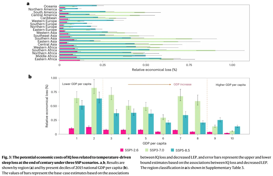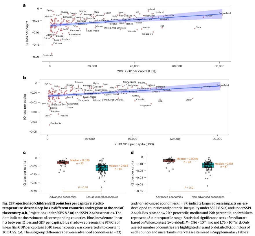 在此基础上,研究进一步采用环境健康领域常用的经济评估模型,将IQ下降转化为劳动生产力损失(LEP),并结合终身收入估值方法,估算由认知能力下降带来的经济成本。具体而言,假设IQ每下降1点对应约2%的生产力损失,并基于美国终身收入数据进行货币化估算,同时按各国人均GDP进行调整,最终得到全球尺度的经济损失(以2015年美元计)。此外,研究通过多种参数调整(如睡眠时间变化、IQ相关系数区间、气候模型差异及经济参数设定)以及蒙特卡洛模拟开展不确定性分析,以评估结果的稳健性和潜在误差范围。
