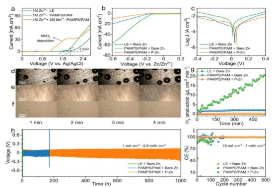 图2(A)不同电解液的OER曲线;b)不同电极/电解液体系中的Her曲线;c)Tafel图;d)Le+Zn,e)PAMPS/PAM+Zn,以及f)PAMPS/PAM+P-Zn;g)析氢体积分布;h)Zn|Zn对称电池在1 mA cm−2,0.5 mAhcm−2下的循环性能;i)Zn|Cu不对称电池的库仑效率。