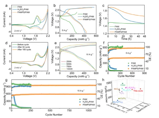 图3(A)循环伏安曲线;b)GCD曲线;c)在不同水凝胶中静置48小时的循环伏安曲线;d)PAMPS/PAMS水凝胶在0、50和100次循环后的循环伏安曲线;e)PAMPS/PAMM水凝胶在特定循环中的GCD曲线;f)5A g−1时的CE曲线;g)10A g−1时的循环性能;h)制造的电池和以前报道的电池的电化学性能