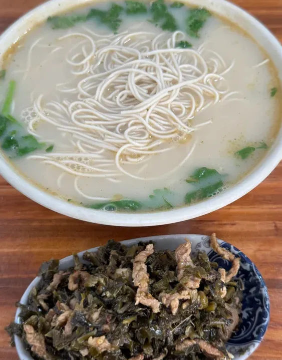 小杂鱼和猪骨一起下锅,先大火滚开,再小火慢熬,熬到汤色发白发乳。捞净渣,留清汤,加姜丝、葱段压一压腥气。面条烫熟,浇汤,撒胡椒和蒜末,热气一冒,整碗就有了。