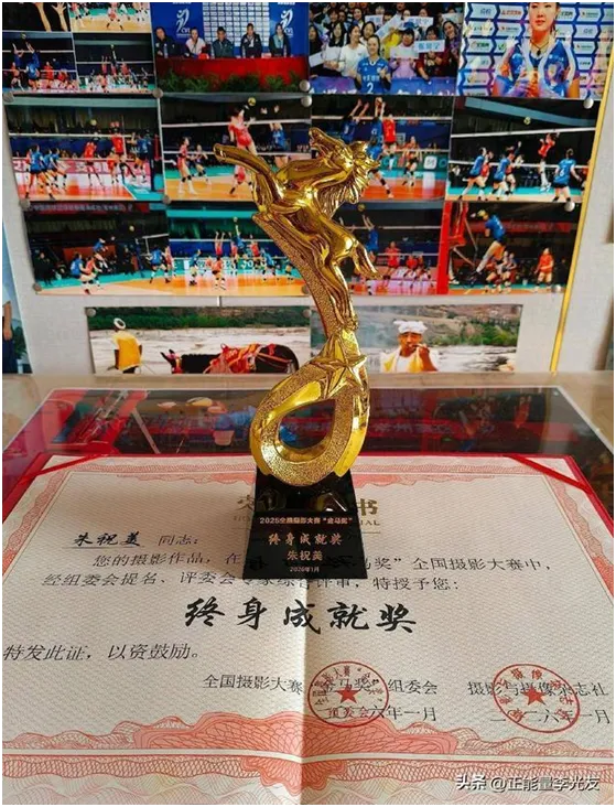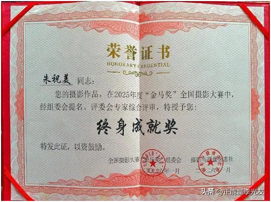 欣逢马年,南京摄影界又传喜讯,南京纪实摄影联盟主持人、著名摄影家朱祝美女士,凭借数十载对摄影艺术的执着追求与取得的非凡成就,荣获了2025年全国摄影大赛“金马奖”终身成就奖!马年春节前夕,朱祝美收到组委会寄来的熠熠生辉的金马奖奖杯,以及荣誉证书与两册装帧精美的《中华全国摄影作品集》。