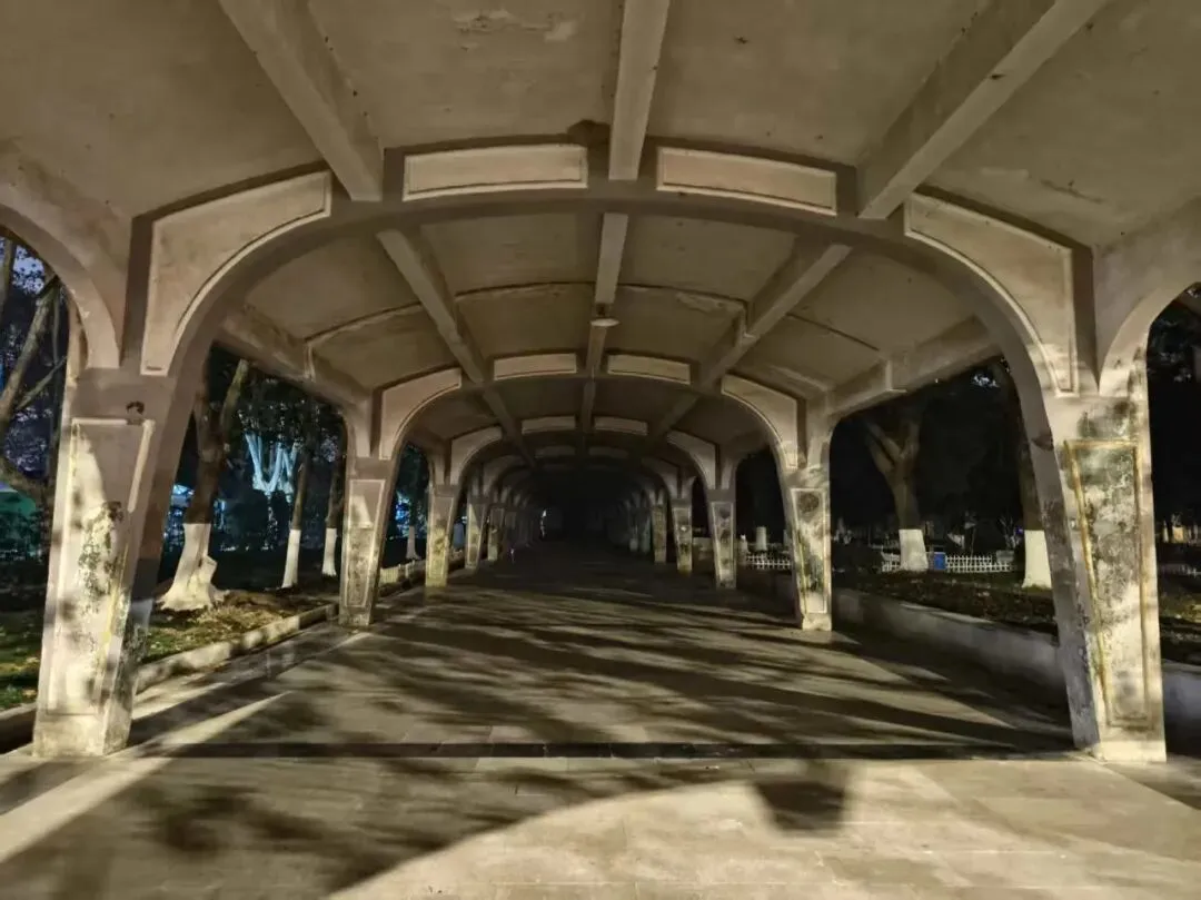 船靠岸,踏入浦口码头。一条拱形雨廊从码头直通火车站,灰砖墙、圆拱顶,斑驳的光影洒落其间。