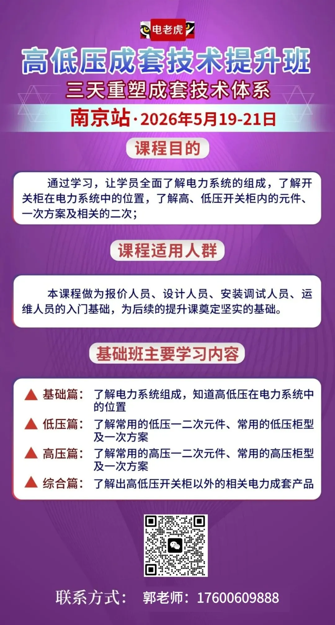 5月19日-5月21日,由虎读商学院专为高低压成套行业技术人员打造的——高低压成套技术提升班,将在南京开课。用3天高密度、体系化、实战型培训,助你完成从技术执行者到系统架构师的关键跃迁!( 文末扫码报名学习,或详情咨询请联系负责人:郭老师 17600609888)