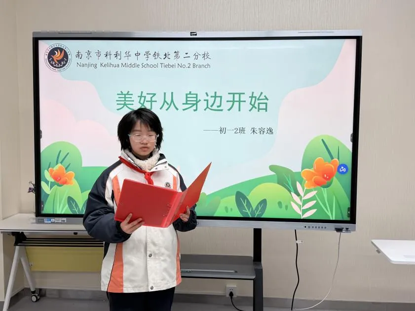 泱泱中华素有 “礼仪之邦” 的美誉,文明礼仪是中华民族的传统美德,更是学子立身行事的基本素养。随后,初一(2)班朱容逸同学带来题为《美好从身边开始》的国旗下讲话,从校园生活点滴出发,阐释文明礼仪的重要意义,呼吁全体同学将文明内化于心、外化于行,从身边小事践行文明规范,让美好始于一言一行、一举一动。