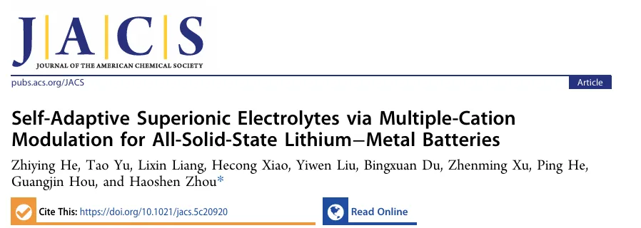 该成果以 “Self-Adaptive Superionic Electrolytes via Multiple-Cation Modulation for All-Solid-State Lithium−Metal Batteries” 为题发表在 “Journal of the American Chemical Society” 期刊,第一作者是He Zhiying。