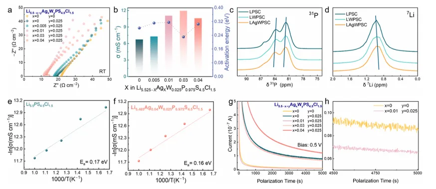 图 2 为调控后固态电解质的离子与电子导电性能表征,交流阻抗测试表明系列电解质室温离子电导率均超 10 mS cm⁻¹ 且活化能低,核磁共振图谱揭示阳离子调控通过改变 Li⁺、P 周围电子环境增强了 Li⁺迁移能力,从头算分子动力学模拟验证了改性电解质 Li⁺扩散能力提升,直流极化测试证明少量 Ag 掺入可有效抑制电子电导率,其中 Li₅.₅₁₅Ag₀.₀₁W₀.₀₂₅P₀.₉₇₅S₄.₅Cl₁.₅实现了离子电导率与电子绝缘性的最优结合。