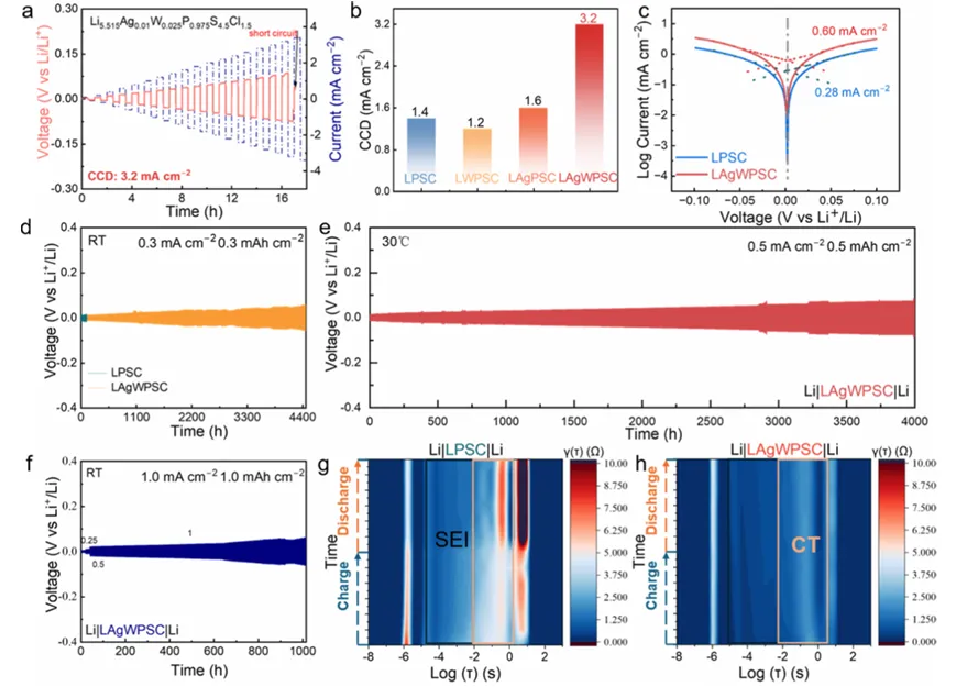 该双阳离子电解质在电池循环过程中展现出自适应性界面调控效应,Ag⁺从电解质中脱嵌还原为 Ag 金属并扩散至锂金属负极形成均匀 Li-Ag 合金,引导 Li⁺均匀沉积 / 剥离,W 则转化为具有中等离子与电子导电性的 LiWS₂并存在于固态电解质界面相中,减少低导电 Li₂S 的生成,同时低模量的 LiWS₂提升界面接触性,协同实现界面阻抗降低、反应动力学加快,Li 对称电池在 0.5 mA cm⁻² 下稳定循环超 4000 h,1 mA cm⁻² 下循环超 1000 h,临界电流密度达 3.2 mA cm⁻²。