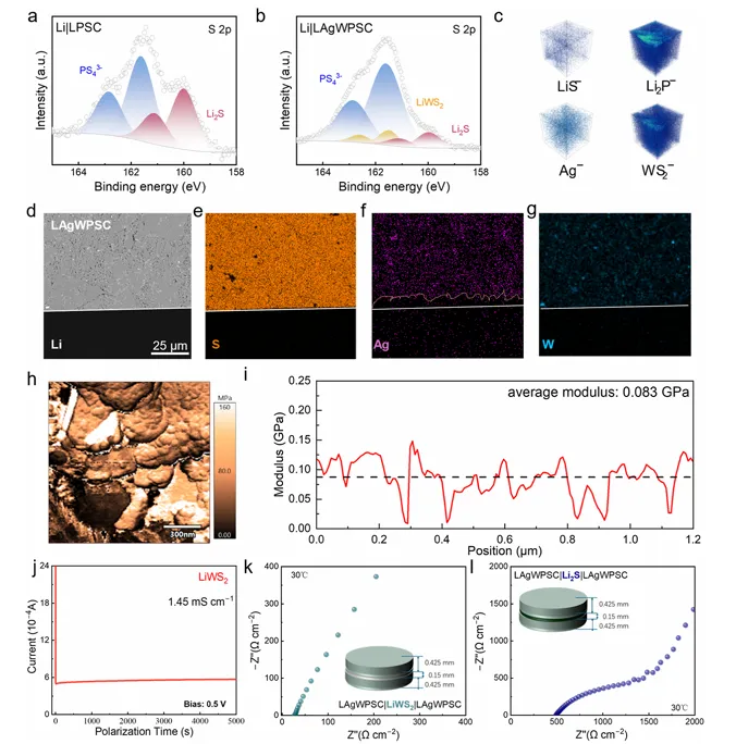 图 4 为双阳离子调控固态电解质与锂金属负极界面相容性提升的机理分析,X 射线光电子能谱表明改性电解质界面低导电 Li₂S 生成量减少且形成了 LiWS₂,飞行时间二次离子质谱与截面扫描电镜证实 Ag 扩散至锂负极形成均匀 Li-Ag 合金且界面接触紧密无空隙,原子力显微镜与电化学测试显示 LiWS₂杨氏模量低、导电性优,可提升界面接触并加快离子传输,同时循环后电解质仍保持低电子电导率,保障了长期循环稳定性。