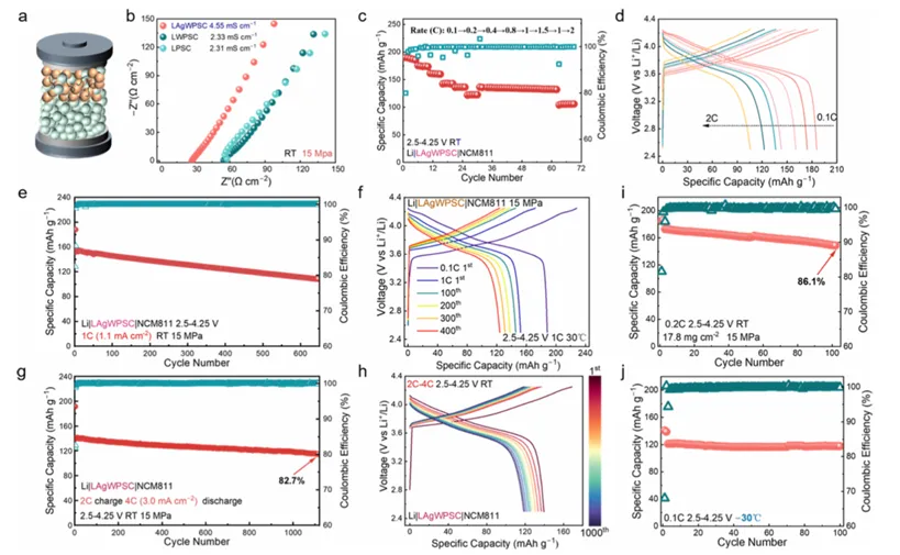 该电解质适配性与实用性优异,基于其组装的 Li//LiNi₀.₈Co₀.₁Mn₀.₁O₂全固态电池展现出卓越的倍率性能与长循环稳定性,2C 下循环 1100 圈容量保持率达 82.7%,在 17.8 mg cm⁻² 的高正极载量、3 mAh cm⁻² 的面容量下 0.2C 循环 100 圈仍有 86.1% 的容量保持率,且在 - 30 ℃低温条件下 0.1C 循环 100 圈容量衰减可忽略,拓展至 Li//S 全固态电池时,1C 下循环 140 圈比容量仍超 1000 mAh g⁻¹,为高能量密度全固态锂金属电池的实用化提供了通用、可规模化的电解质设计策略。