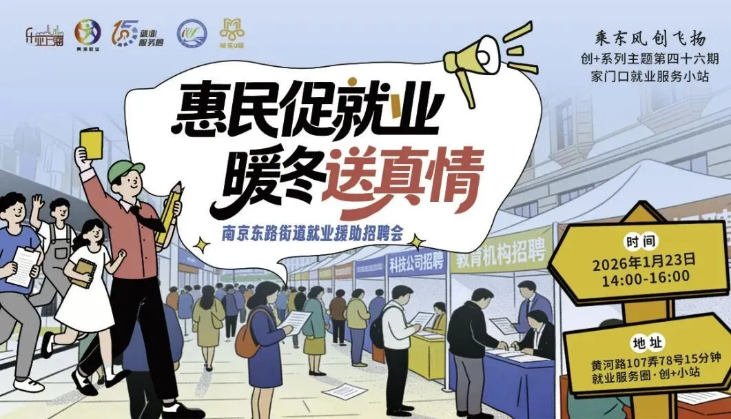 这个冬天,好工作与温暖并肩而来!1月23日,南京东路街道就业援助招聘会将在黄河路107弄78号15分钟就业服务圈・创+小站暖心启幕!家门口的就业小站,帮你在寒冬里 “职” 通心意,我们邀你共赴这场就业之约,一同解锁就业新可能,奔赴美好生活!