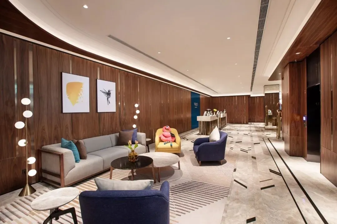 大堂随处可见燕雀挂画和摆件,燕雀也是voco的吉祥物之一,象征着开朗、热情。点题的火烈鸟公仔,燃爆了整个空间的气场……在视觉的魔力中,voco品牌三个吉祥物无处不在,每件有指示意义的装饰品、印刷品,无论大小,都和这三只鸟紧密相关,氛围感十足。自然而然,它们也成为摆拍的绝佳道具。