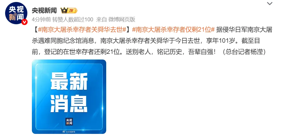 据侵华日军南京大屠杀遇难同胞纪念馆消息,南京大屠杀幸存者关舜华于今日(3月18日)去世,享年101岁。截至目前,登记的在世幸存者还剩21位。送别老人,铭记历史,吾辈自强!