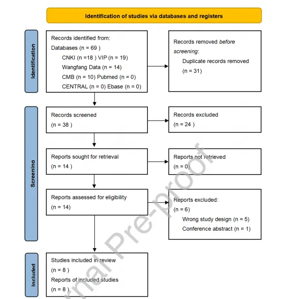 系统检索共获得69篇文献,经去重、初筛和全文复筛,最终纳入8项随机对照试验(RCT),共计646例患者,用于评估XSLJZD治疗RE的临床疗效和安全性的Meta分析。