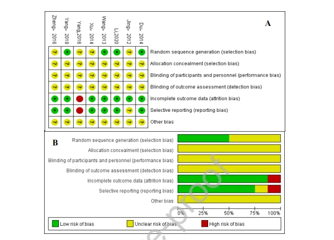 对8项RCT的方法学质量进行评估。结果显示,所有研究在随机序列生成方面描述不清,多数在分配隐藏和盲法上存在高偏倚风险或不明确,总体证据质量偏低。