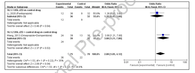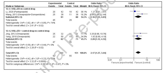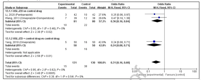 总体分析显示XSLJZD组胃镜下黏膜愈合率更优(OR=2.19)。单用XSLJZD亚组无显著差异,而联合治疗亚组则显示出显著的愈合优势。