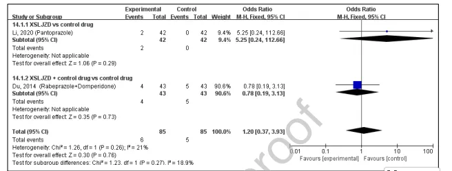基于2项研究的分析显示,XSLJZD组与对照组在不良事件发生率上无显著差异(OR=1.27),但由于单个亚组仅包含一项研究。