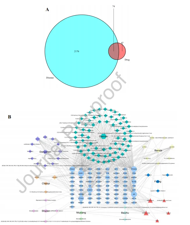 图10:药物-疾病靶点韦恩图与成分-靶点网络图