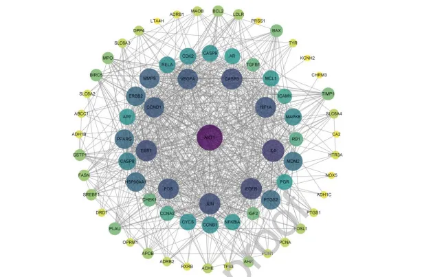 使用Cytoscape对PPI网络进行可视化,节点大小与度值成正比,直观地展示了AKT1、IL6、JUN等在网络中处于核心位置的靶点。