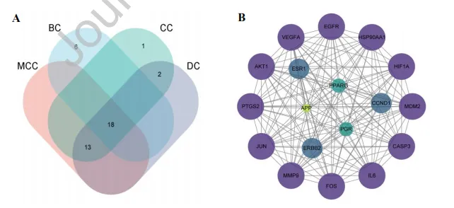 图13:核心靶点的筛选韦恩图与网络图