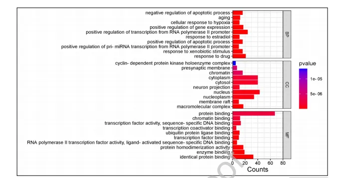 GO分析显示,交集靶点主要富集在对化学刺激的反应、凋亡过程等生物过程,以及膜筏、受体复合物等细胞组分,涉及蛋白结合、转录因子结合等分子功能。