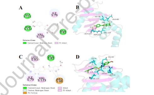 分子对接显示,木犀草素(-7.96 kcal/mol)与AP-1的结合能低于奥美拉唑(-7.12 kcal/mol)。木犀草素与GLU82、GLY121、ASP122形成三个氢键,结合更稳定。