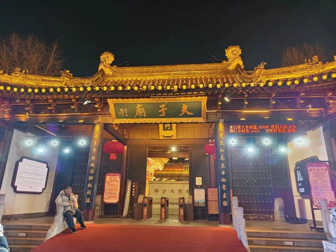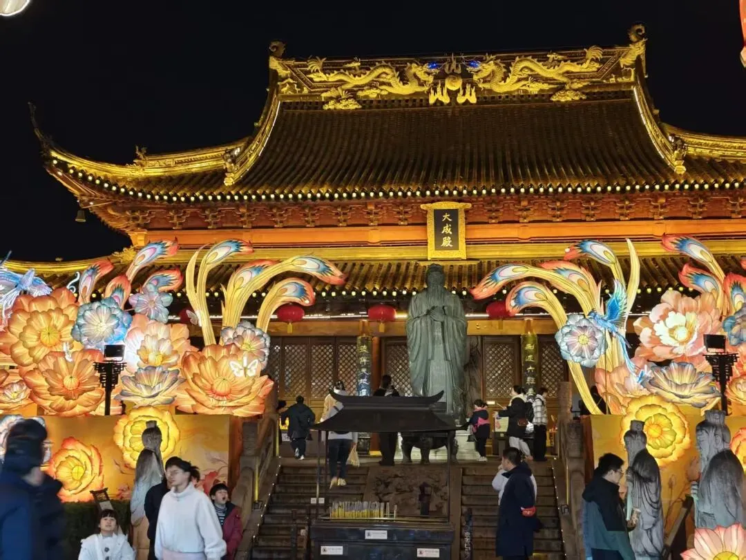 大成殿前宫灯璀璨,天下文枢的牌坊在夜色里更显庄重,灯影与古建相映着,互为造景,既有市井的热闹,又有诗书的清雅!